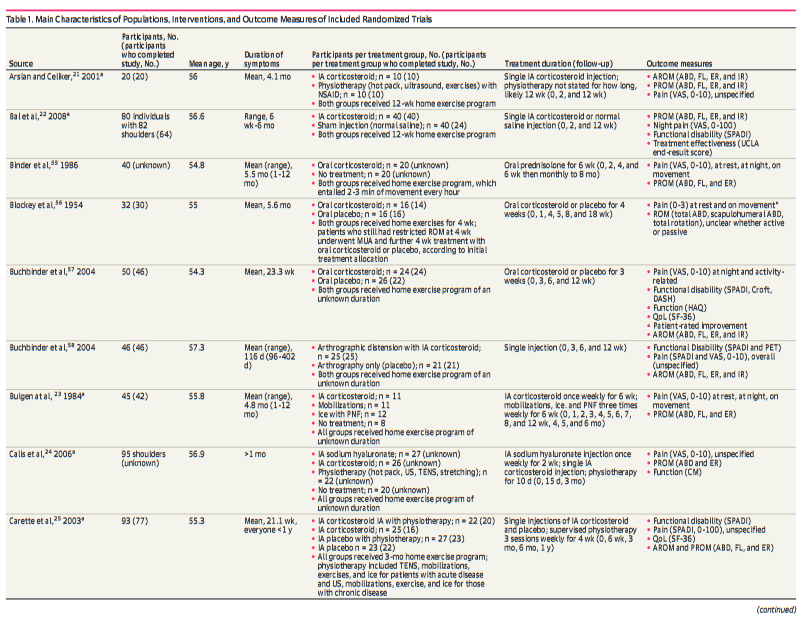 - participant : patients with frozen shoulder of any etiology, duration, and severity;