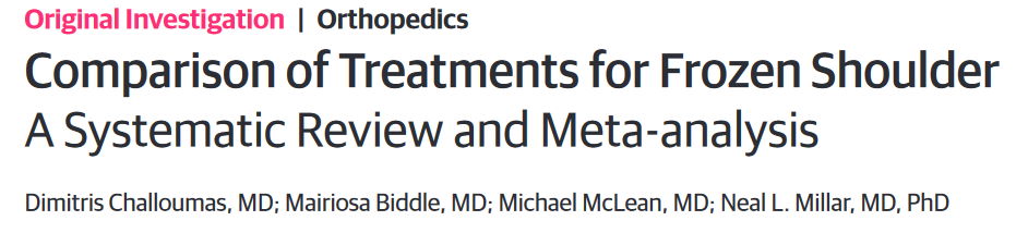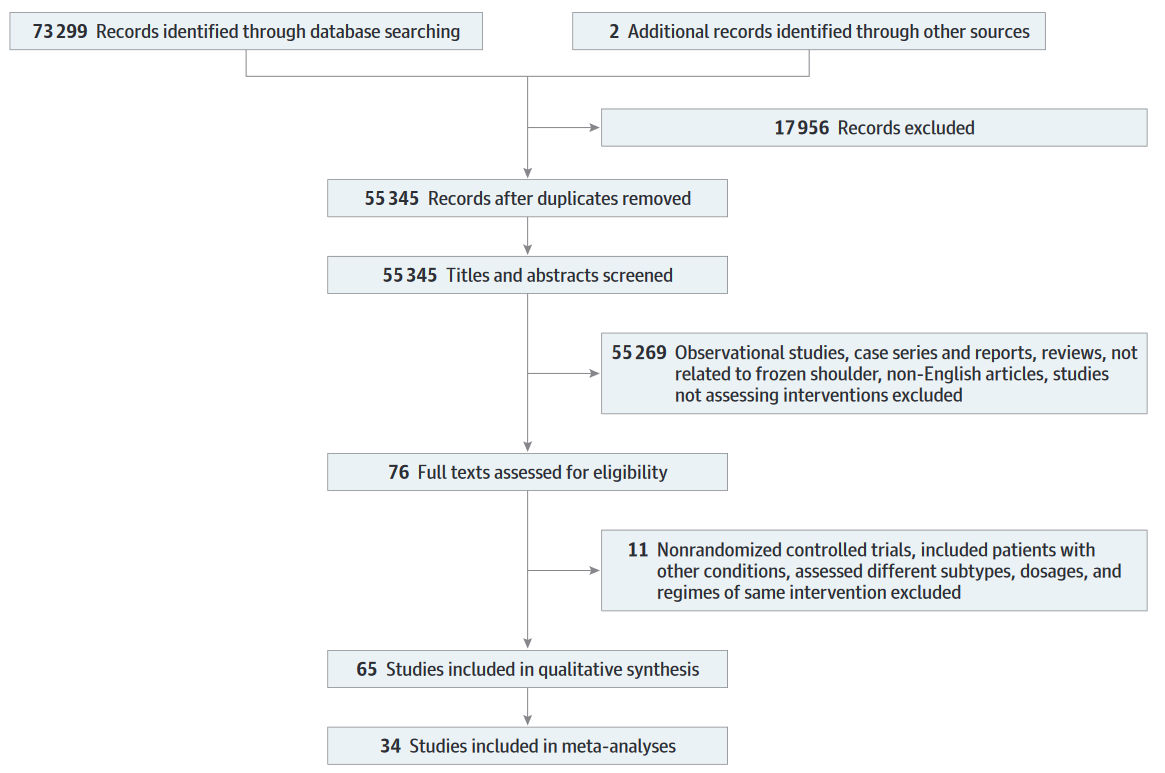 2020년 2월에 MEDLINE, Embase, Scopus, CINAHL을 검색하였고, frozen shoulder을 치료하는 여러 modality, no treatment, placebo 등을 비교한 Randomized study를 수집하였다.
