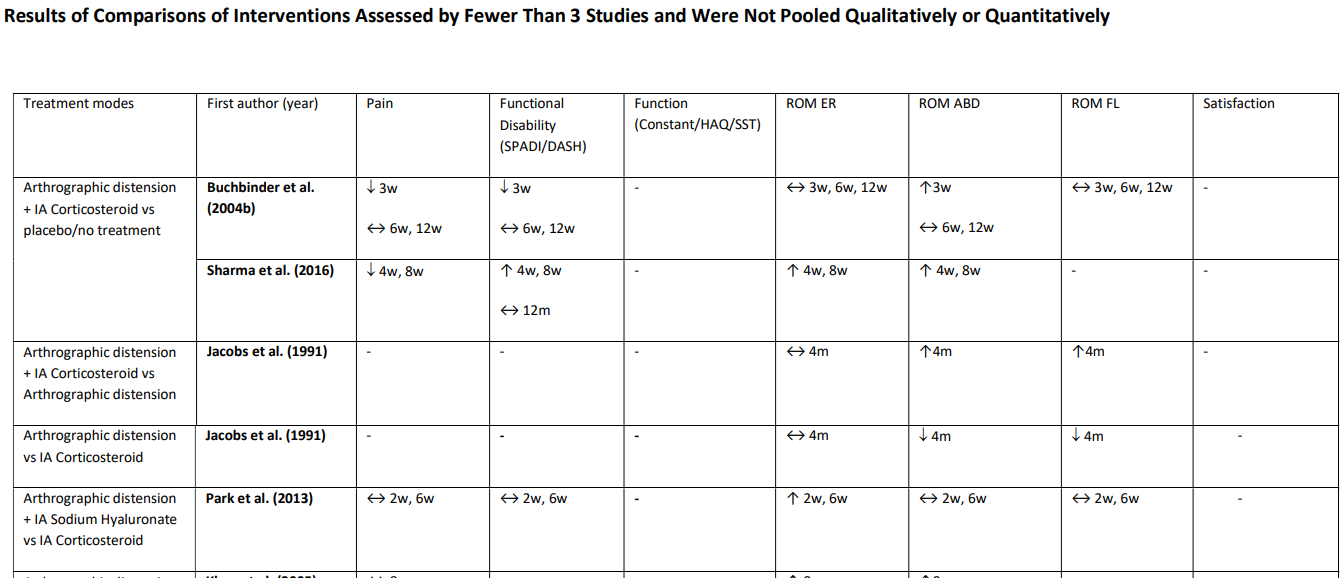 IA steroid : short term에서 pain, ROM, function이 호전되었고, mid term에서는 function만 호전되었다.