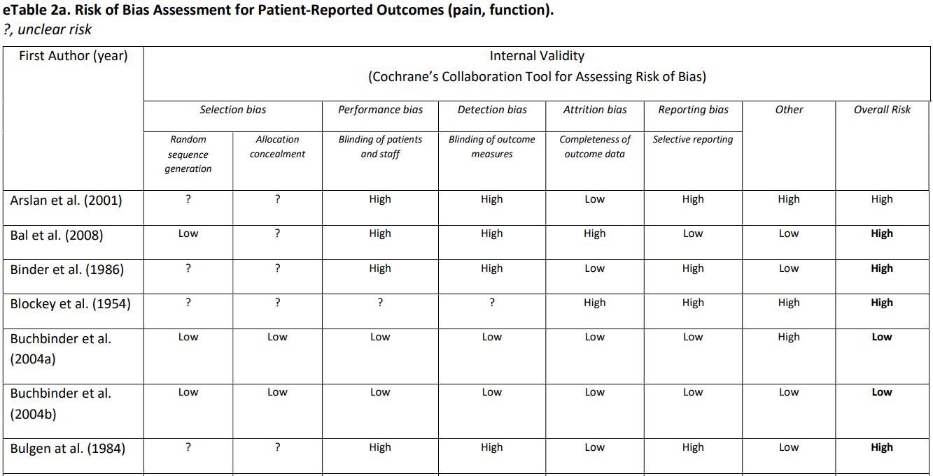 연구들의 internal validity는 Cochrane Collaboration's tool for assessing risk of bias in randomized trials를 활용하여 평가되었는데, PROM인 pain, function과 그렇지 않은 ROM(range of motion)을 각각 평가하였고,