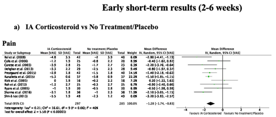 ealry short term f/u에서 IA corticostreoid와 placebo/No Tx. 를 비교했을 때