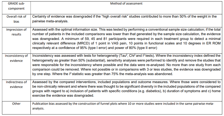 다만 Frozen shoulder의 정확한 진단 criteria가 없기 때문에 이를 risk-of-bias assessment에서 다뤘다고 기술하고 있다.